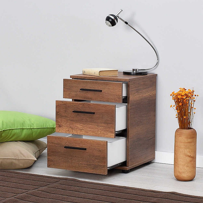 Κομοδίνο με τρία συρτάρια κατασκευασμένο από μελαμίνη υψηλής ποιότητας και ανθεκτικότητας στον χρόνο σε χρώμα καρυδί. Ιδανική και κομψή επιλογή για κάθε χώρο καθώς μπορεί εύκολα να εναρμονιστεί με την υπάρχουσα διακόσμηση και να ομορφύνει τον χώρο που θα τοποθετηθεί.