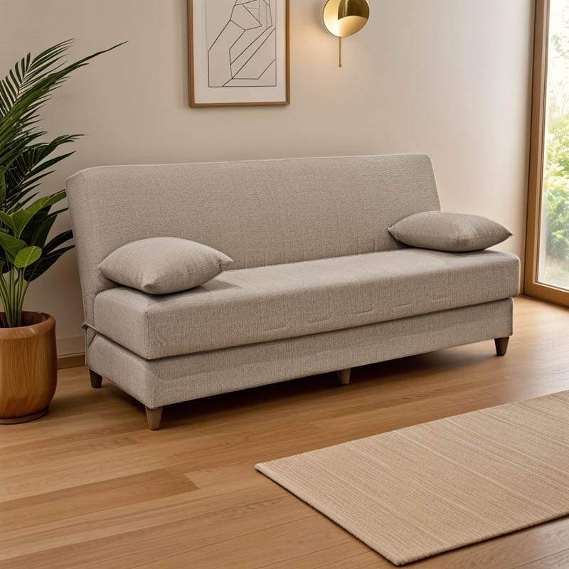 Anima τριθέσιος καναπές/κρεβάτι με ύφασμα σε χρώμα light brown και καπιτονέ σχεδιασμό. Ένας κομψός και ευέλικτος καναπές, που μετατρέπεται εύκολα και γρήγορα σε κρεβάτι όταν χρειαστεί. Διαθέτει διακοσμητικά μαξιλάρια που προσθέτουν στυλ και