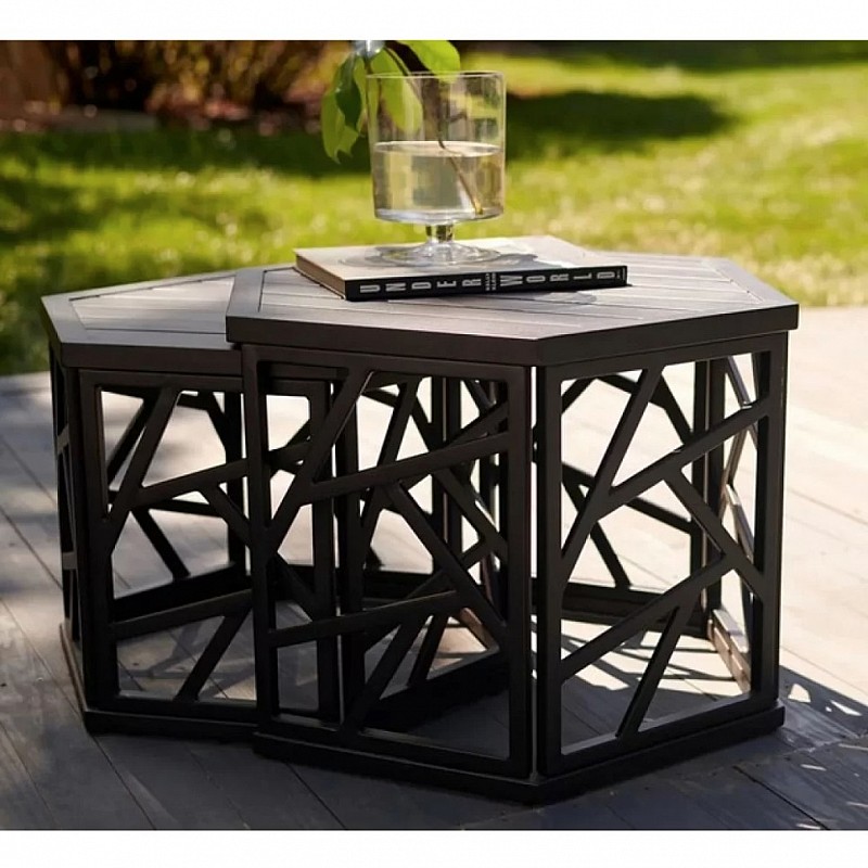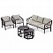 Σετ σαλονιού εξωτερικού χώρου που αποτελείται από έναν τριθέσιο καναπέ, δύο πολυθρόνες με γκρι μαξιλάρια και δύο τραπεζάκια. Το σετ είναι κατασκευασμένο από σκελετό χάλυβα με επιστρωση πούδρας και μαύρο φινίρισμα με μεγάλη διάρκεια ζωής για εποχιακή χρήση. Μία κομψή επιλογή για τον χώρο σας καθώς το design περιλαμβάνει περίπλοκους γεωμετρικούς βραχίονες και έντονες γωνίες αναδεικνύοντας έτσι κάθε υπαίθριο χώρο στον οποίο τοποθετείται. Επιπλέον τα μαξιλάρια είναι ντυμένα με μαλακό ύφασμα πολυεστέρα δημηιουργώντας μία αίσθηση χαλάρωσης.